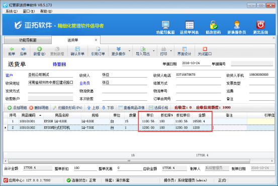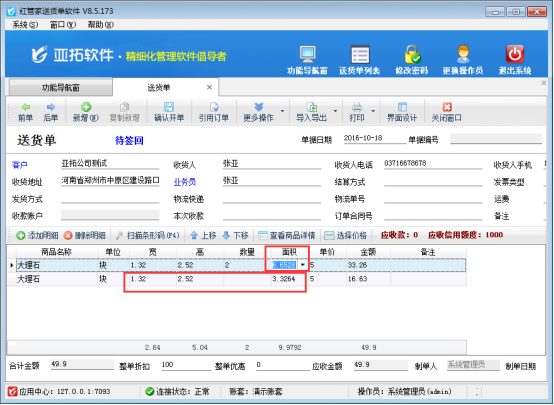 對于不同的商品都能夠使用軟件開單計算,亞拓軟件下的送貨單軟件和亞拓管理軟件等都支持可在開單界面設置擴展數值來支持計算公式的使用,比如有些商品需要寬乘高來計算面積。為了使客戶對于計算公式的計算結果更便捷使用,軟件可設置修改由配置計算公式得的計算結果。 以送貨單軟件為例,正常的配置計算公式開單,計算結果是不允許修改,如下圖所示:圖:設置計算公式下的計算結果情況 設置可修改由計算公式得出的計算結果過程:首先在“系統管理”—》“系統參數配置”勾選相應的業務參數并保存配置