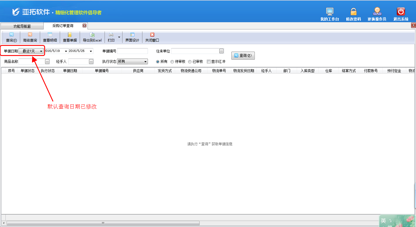 亞拓管理軟件(精細(xì)化管理軟件、進(jìn)銷存管理軟件、記賬軟件)及紅管家倉庫管理軟件內(nèi)都包含了統(tǒng)計(jì)查詢功能(采購單匯總表、銷售單匯總表、銷售單明細(xì)查詢、銷售毛利匯總等統(tǒng)計(jì)查詢報(bào)表),軟件內(nèi)統(tǒng)計(jì)查詢功能默認(rèn)的查詢?nèi)掌跒椤白罱?個月”(如下圖一所示),但是如果需要修改默認(rèn)查詢?nèi)掌,該如何修改呢?下面我們以亞拓管理軟件專業(yè)版為例詳細(xì)介紹下軟件內(nèi)如何修改默認(rèn)查詢?nèi)掌。圖一 采購訂單查詢界面 在功能導(dǎo)航窗點(diǎn)擊“系統(tǒng)管理”——“系統(tǒng)參數(shù)配置”——“系統(tǒng)參數(shù)”,在“系統(tǒng)參數(shù)”界面可以修改“默認(rèn)查詢?nèi)掌凇保ㄟ@里修改為“最近7天”),修
