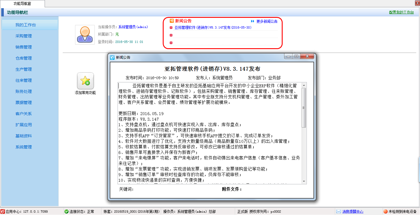 亞拓管理軟件專業(yè)版內(nèi)包含新聞公告管理模塊,新聞公告管理功能可以實(shí)現(xiàn)企業(yè)動態(tài)新聞的實(shí)時(shí)顯示,一方面可以用來發(fā)布公司內(nèi)部公告、通知、新聞等,另一方面也可以向客戶展示最新產(chǎn)品或者是優(yōu)惠活動等。 在功能導(dǎo)航窗點(diǎn)擊“擴(kuò)展應(yīng)用”—》“新聞公告管理”即可進(jìn)入“新聞公告管理”界面,其界面如下圖所示: 新增新聞公告:點(diǎn)擊工具欄的“新增”按鈕即可新增新聞公告,可以選擇“發(fā)布范圍”及“查看范圍”,發(fā)布在“內(nèi)部”時(shí),有查看權(quán)限的操作員登錄系統(tǒng)后即可查看到已發(fā)布的新聞公告,發(fā)布在“客戶服務(wù)平臺”時(shí),客戶賬號在“
