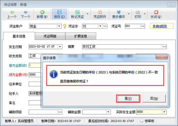 出納記賬軟件登記日記賬憑證時,發生日期默認取電腦操作系統日期,另外如需要補錄出納憑證,系統也支持修改日記賬憑證的發生日期進行補錄出納憑證,部分用戶在登記完日記賬憑證后可能會出現找不到已保存的出納憑證的情況,此種情況下可放大查詢日期范圍進行查詢,另外,軟件也支持設置錄入出納憑證時發生日期的年份與系統日期的年度不一樣時進行提醒功能,本篇文章介紹一下設置方法。 在功能導航窗點擊“系統管理”—》“系統參數配置”,在“出納參數”界面勾選“錄入出納憑證時發生日期的年份與系統日期的年度不一樣時提醒”參數,然后點擊“保存”按鈕保存參數配