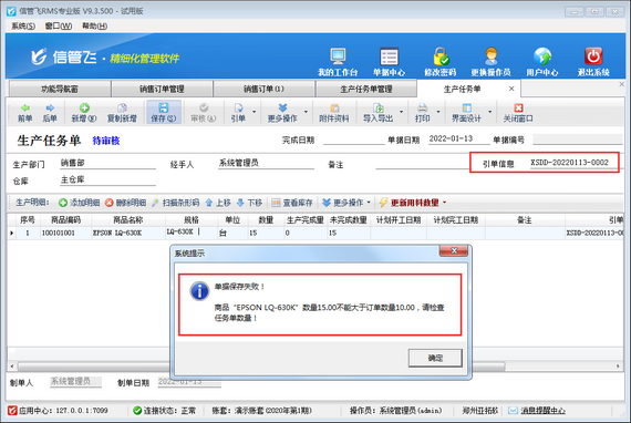 生產(chǎn)任務(wù)單,即生產(chǎn)過程中的任務(wù)加工單,用于執(zhí)行生產(chǎn)計劃,進(jìn)入實(shí)際生產(chǎn)階段。生產(chǎn)任務(wù)單支持引用銷售訂單及生產(chǎn)計劃單進(jìn)行開單下達(dá)生產(chǎn)任務(wù)數(shù)量,本篇文章介紹一下生產(chǎn)任務(wù)單引用銷售訂單開單的情況下,如何設(shè)置生產(chǎn)任務(wù)單數(shù)量不可大于銷售訂單數(shù)量? 在功能導(dǎo)航窗點(diǎn)擊“系統(tǒng)管理”—》“系統(tǒng)參數(shù)配置”—》“業(yè)務(wù)參數(shù)”打開業(yè)務(wù)參數(shù)配置界面,在生產(chǎn)管理相關(guān)參數(shù)中打鉤啟用“生產(chǎn)任務(wù)單數(shù)量不可大于銷售訂單數(shù)量”參數(shù),如下圖所示。 參數(shù)配置完成之后,新開一個銷售訂單,如下圖所示。