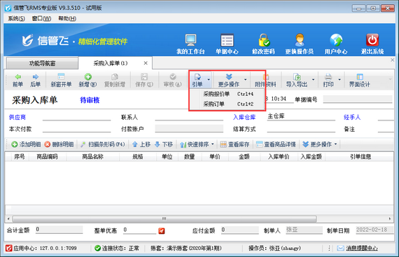 信管飛RMS(進(jìn)銷存管理軟件)支持根據(jù)銷售訂單進(jìn)行采購入庫進(jìn)貨(如下圖所示),同時也支持配置操作員采購入庫單引用銷售訂單開單權(quán)限,本篇文章介紹一下進(jìn)銷存管理軟件內(nèi)如何設(shè)置操作員開采購入庫單不可引用銷售訂單? 在功能導(dǎo)航窗點(diǎn)“系統(tǒng)管理”—》“操作員及授權(quán)”即可進(jìn)入“操作員管理及授權(quán)”界面,選中操作員賬號,在“其他操作權(quán)限”界面將“采購入庫單可引用銷售訂單”權(quán)限打鉤取消,然后保存權(quán)限設(shè)置,如下圖所示,設(shè)置操作員張亞沒有“采購入庫單可引用銷售訂單”權(quán)限。 設(shè)置完成后,我們使用操作員賬號登錄軟