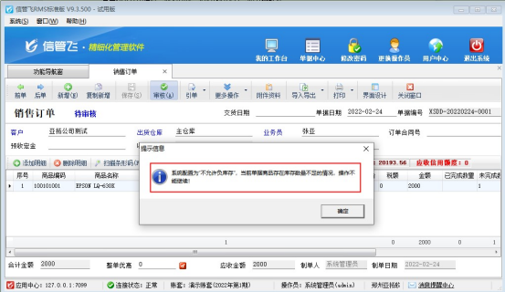 信管飛RMS軟件、信管飛倉庫管理軟件支持管理商品庫存,商品進(jìn)出庫單據(jù)審核后庫存自動增減,默認(rèn)開單允許負(fù)庫存出庫,有用戶需要下銷售訂單時負(fù)庫存無法下單的情況,本文以“信管飛RMS軟件”,示范下如何設(shè)置銷售訂單負(fù)庫存不能審核。 在功能導(dǎo)航窗點(diǎn)擊“系統(tǒng)管理”—》“系統(tǒng)參數(shù)配置”選擇“業(yè)務(wù)參數(shù)”,找到參數(shù)“銷售訂單審核允許負(fù)庫存”取消勾選,然后保存配置,如下圖所示: 參數(shù)設(shè)置完成后,功能導(dǎo)航窗點(diǎn)擊“銷售管理”,打開銷售訂單新增界面,選擇選擇一個無庫存的商品,