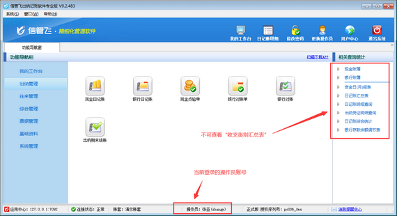 信管飛出納記賬軟件內(nèi)包含豐富的記賬統(tǒng)計(jì)報(bào)表,如現(xiàn)金賬簿、銀行賬簿、資金日(月)報(bào)表、收支類別匯總表等。如果不希望員工賬號(hào)登錄后查看到這些報(bào)表,如何設(shè)置呢?本篇文章以信管飛出納記賬軟件專業(yè)版為例演示一下出納記賬軟件內(nèi)如何設(shè)置操作員不可查看收支類別匯總表? 登錄軟件,在功能導(dǎo)航窗點(diǎn)擊“系統(tǒng)管理”—》“操作員及授權(quán)”,進(jìn)入“操作員管理及授權(quán)”界面,選擇操作員“張亞”,在其右側(cè)的功能模塊權(quán)限內(nèi)選擇“出納查詢”模塊,將收支類別匯總表的“使用”權(quán)限勾選取消,然后保存設(shè)置,如下圖所示。 操作員權(quán)限設(shè)