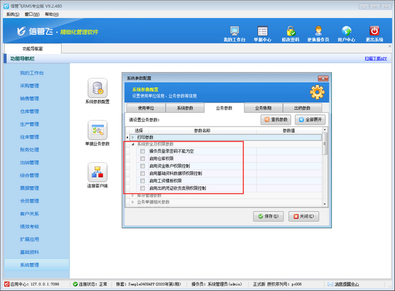 信管飛軟件系列產品都支持靈活配置業務參數,支持設置多個操作員賬號及操作員權限,本文介紹下信管飛RMS業務參數中系統安全及權限參數如何使用。 在功能導航窗點擊“系統管理”—》“系統參數配置”—》“業務參數”可以打開業務參數配置界面,啟用全部折疊,找到“系統安全及權限參數”,可以看到“系統安全及權限參數”包含以下參數,如下圖所示: 1、操作員登錄密碼不能為空:默認不勾選,勾選后必須設置軟件登錄密碼,輸入密碼才可以登錄軟件。以下是文章詳細介紹。 信管飛RMS