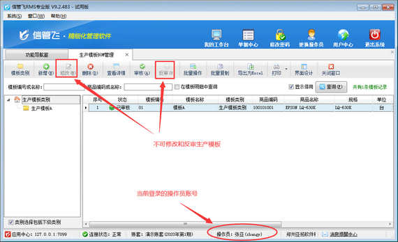 生產模板,即BOM清單(物料清單),可配置每生產一個標準單位的產品需要的原材料種類和數量。為了避免操作員誤修改生產模板數據,軟件支持設置操作員賬號不允許修改生產模板,本篇文章介紹一下進銷存管理軟件中如何設置操作員不可修改生產模板? 登錄軟件,在功能導航窗點擊“系統管理”—》“操作員及授權”,進入“操作員管理及授權”界面,選擇操作員“張亞”,在其右側的功能模塊權限內選擇“生產管理”模塊,將生產模板BOM的“反審修改”權限勾選取消,然后保存設置,如下圖所示。 操作員權限設置完成后,關閉當前