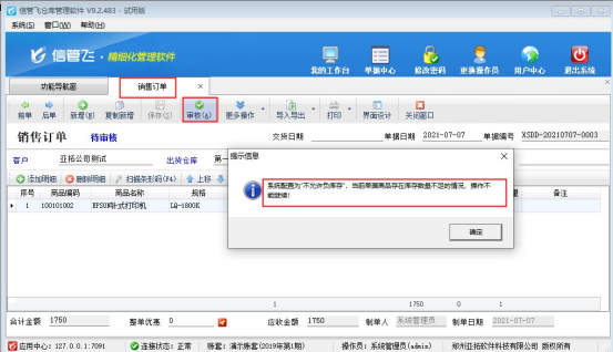 信管飛倉庫管理軟件、信管飛RMS軟件都支持管理商品庫存,軟件默認允許負庫存出庫,對于銷售訂單有用戶需要商品沒有庫存的時候無法下訂單,本文以“倉庫管理軟件”為例,示范下如何設置銷售訂單商品負庫存時不能審核。 演示視頻觀看鏈接:倉庫管理軟件如何設置銷售訂單商品負庫存不能審核? 在功能導航窗點擊“系統管理”—》“系統參數配置”選擇“業務參數”,找到參數“銷售訂單審核允許負庫存”取消勾選,然后保存配置,如下圖所示: &nbs