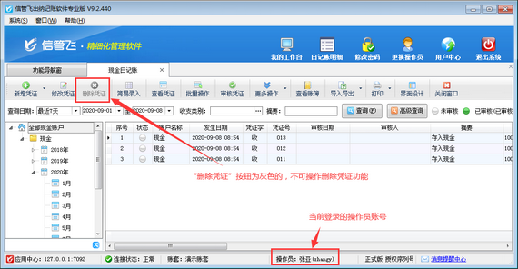 信管飛出納記賬軟件中支持刪除憑證,憑證保存后如發現填寫錯誤,可以刪除憑證重新新增,如下圖所示。 如果需要操作員不可刪除日記賬憑證,軟件也支持設置操作員不可刪除日記賬憑證權限,下面以信管飛出納記賬軟件專業版為例來演示一下設置操作員不可刪除日記賬憑證權限操作步驟。 登錄軟件,在功能導航窗點擊“系統管理”—》“操作員及授權”,進入“操作員管理及授權”界面,選擇操作員“張亞”,在其右側的功能模塊權限內選擇“出納管理”模塊,將現金日記賬和銀行日記賬的“刪除”權限取消勾選,然后保存設置,如下圖所示