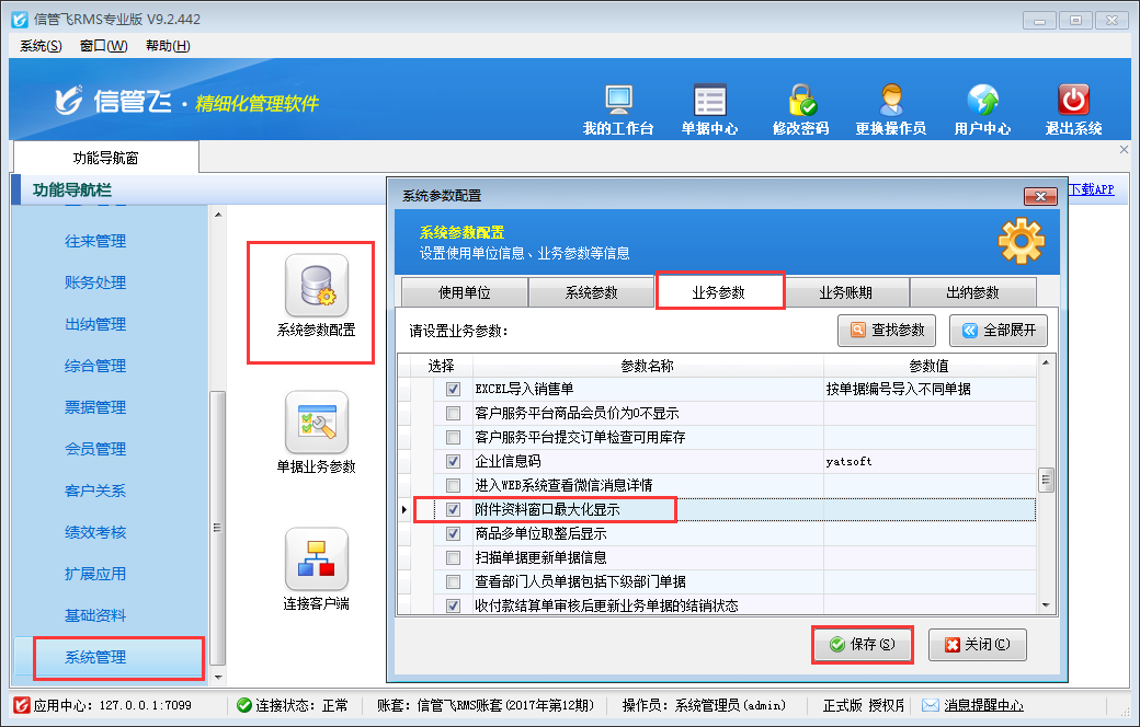 信管飛RMS(進銷存管理軟件)新增或者修改業務單據時,支持添加文檔、圖表等附件資料,可掃描或導入與業務單據相關的電子文件,方便用戶更全面、直接地查詢業務單據的全過程,有利于企業對業務單據的管理(如下圖所示),附加資料窗口默認顯示模式支持大窗口和小窗口兩種顯示模式,本文介紹一下如何設置附件資料窗口默認顯示模式? 在功能導航窗點擊“系統管理”—》“系統參數配置”—》“業務參數”打開業務參數配置界面,然后在特殊功能參數中可以找到“附件資料最大化顯示”參數,如下圖所示。 “附件資料最大化顯示