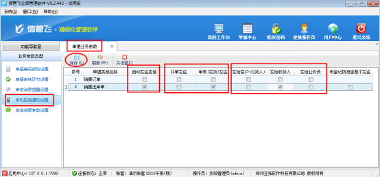 信管飛倉庫管理軟件集成了手機短信發送服務,可以發送開單通知、發貨通知、生日祝福等業務短信。軟件中可以設置短信模板,系統會自動調取單據中的內容,無需我們手動輸入繁瑣的內容,可以節約我們寶貴的時間和精力。軟件也支持自定義發送短信。統一采用1065全國全網正規通道,速度更快,更能提升企業形象,軟件只能發送發貨通知等業務短信,嚴禁群發營銷短信。 手機短信管理屬于增值業務,具體開通方式可聯系客服進行咨詢。以信管飛倉庫管理軟件為例,來介紹下如何對設置開單自動發送短信。 登錄軟件,在功能導航窗點擊“