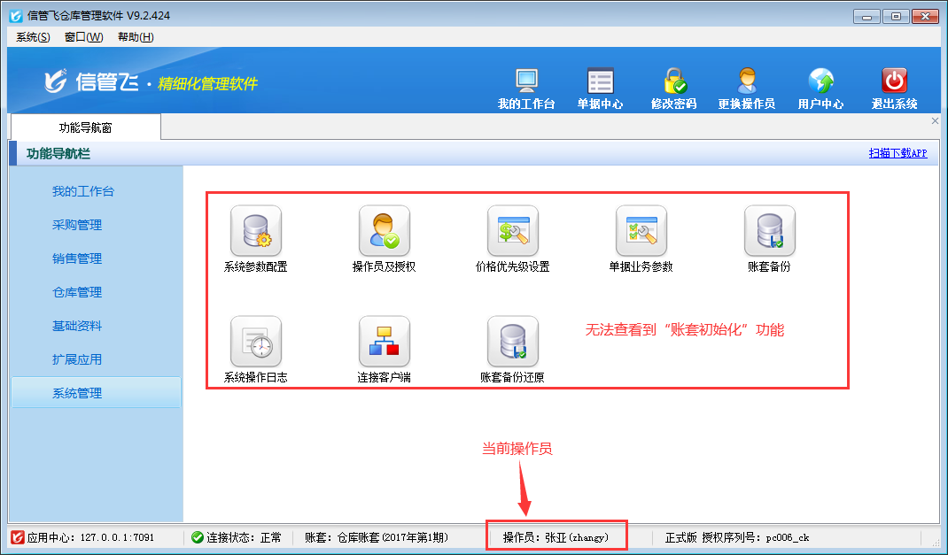 賬套初始化一般用于在正式使用軟件前,對賬套中的數據進行初始化,以便重新錄入數據。一般在試用軟件期間會輸入一些試用的數據,比如采購入庫單、銷售出庫單或一些訂單等信息,當試用結束后想刪除這些無用的數據錄入正式數據時,可以通過本系統的“帳套初始化”功能來一次性清除,方便快捷(如下圖所示)。 執行賬套初始化操作后,會刪除賬套內相應的數據,因此務必提前做好備份,謹慎操作!為了避免操作員誤操作,導致數據丟失,軟件內支持設置操作員不可進行賬套初始化操作,下面以信管飛倉庫管理軟件為例來演示一下具體的操作步驟。 &n
