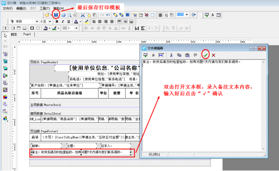 信管飛送貨單軟件、信管飛RMS、信管飛倉庫管理軟件都支持開單打印送貨單(銷售單),打印模板下方一般都會有備注信息或注意事項,不同的公司備注信息也不同,客戶可以自定義修改模板的備注內容,下面介紹一下如何修改固定的備注字樣。 以送貨單軟件為例,選擇一個送貨單單據,選擇“打印”—》“打印格式設計”—》“設計格式”進入打印模板設計器頁面,如下圖1、圖2所示:圖1圖2 在設計器上,選擇模板下方“備注”文本框,雙擊打開,輸入備注文本內容,點擊“√”確定,最后保存打印模板即可。如下圖3所示:圖3&n