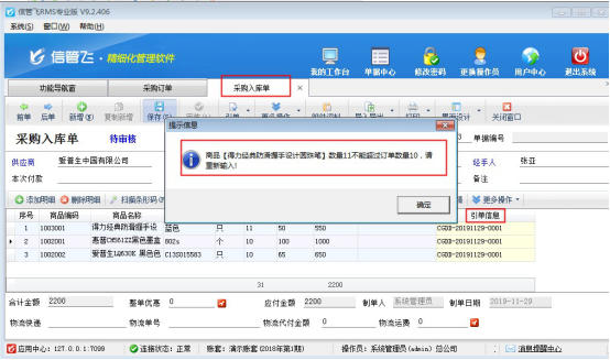 客戶在采購貨品時有時需要先由庫存人員根據(jù)實際庫存開采購訂單,然后采購人員根據(jù)采購訂單進行采購入庫。為避免采購數(shù)量大于訂單數(shù)量,軟件支持控制采購數(shù)量不可超過訂單數(shù)量,本文以“信管飛RMS軟件”為例,示范下如何設置“采購數(shù)量不可超過訂單數(shù)量”。 在功能導航窗點擊“系統(tǒng)管理”—》“系統(tǒng)參數(shù)配置”—》“業(yè)務參數(shù)”,即可進入到“業(yè)務參數(shù)”界面,勾選“采購數(shù)量不可超過訂單數(shù)量”參數(shù),然后點擊“保存”按鈕保存配置,如下圖所示。 設置完之后,在功能導航窗點擊“采購管
