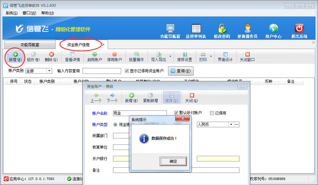 收款結算單用來登記收款信息(收款對象即客戶、收款賬戶、收款金額、經(jīng)手人等),并結銷應收款記錄。部分用戶在剛開始使用送貨單軟件對軟件功能不熟悉,首次對應收款進行收款結算,錄入收款金額時會提示:默認收付款資金賬戶不存在,請先設定默認收付款資金賬戶。ㄈ缦聢D所示)無法繼續(xù)填開收款結算單。 這種情況是因為在系統(tǒng)內(nèi)沒有維護收款賬戶導致的,請在功能導航窗點擊“基礎資料”—》“資金賬戶”打開資金賬戶管理界面增加資金賬戶即可,如下圖所示。 資金賬戶新增之后,重新對應收款進行收款結算即可,如何填開收款結