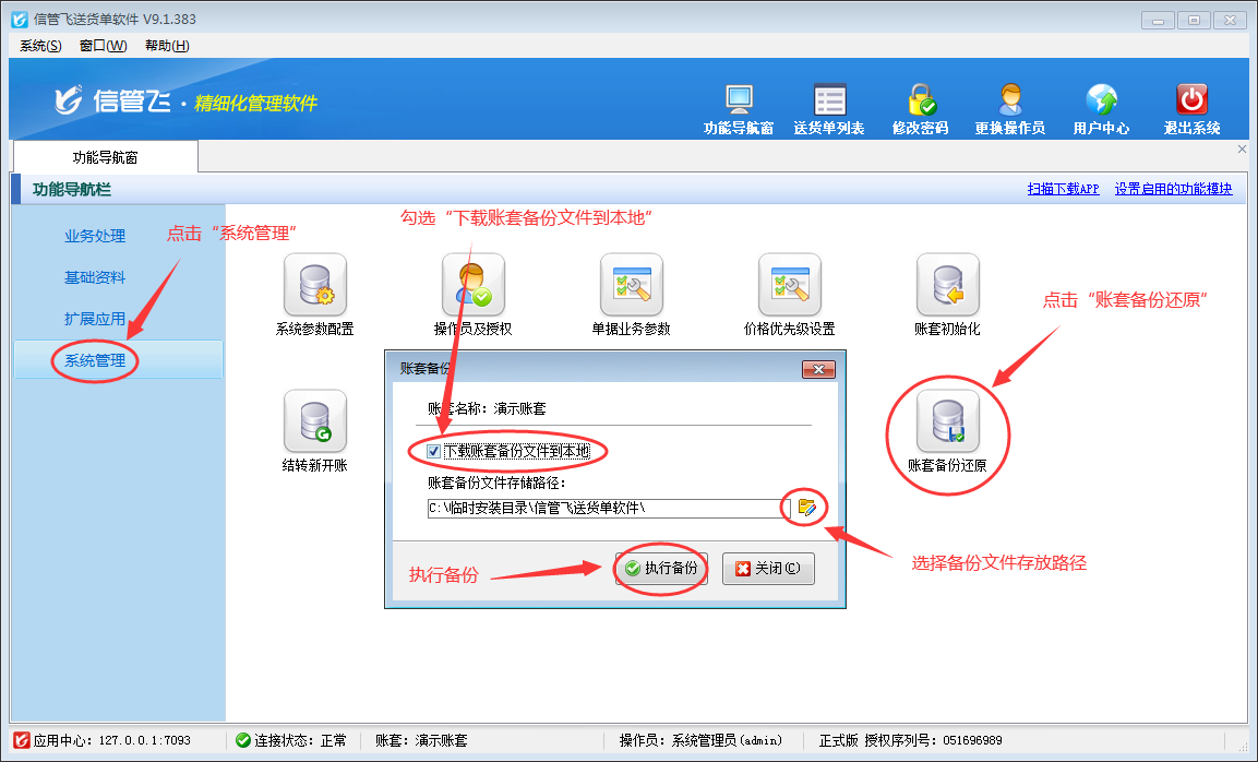 信管飛倉庫管理軟件、信管飛出納記賬軟件、信管飛送貨單軟件、信管飛RMS等軟件賬套數(shù)據(jù)默認(rèn)存儲在軟件安裝目錄下,支持對賬套數(shù)據(jù)進(jìn)行備份,如需要更換主機電腦,需要在原來的主機電腦上備份賬套數(shù)據(jù),將生成的備份文件復(fù)制到新的主機電腦上,然后在新的主機電腦上安裝軟件,使用備份文件還原數(shù)據(jù)即可。 以信管飛送貨單軟件為例,演示一下更換電腦時如何在原來的主機電腦上備份賬套數(shù)據(jù)? 一、在信管飛送貨單軟件應(yīng)用中心程序中執(zhí)行賬套備份。 請在應(yīng)用中心程序中,點擊“賬套管理”