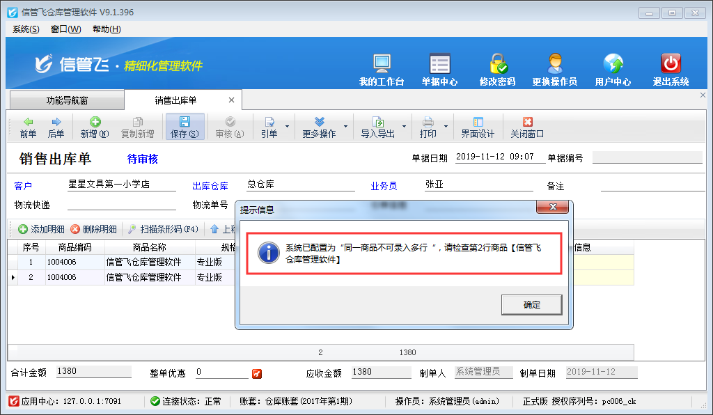 信管飛送貨單軟件、信管飛倉庫管理軟件、信管飛RMS等軟件在新開業(yè)務(wù)單據(jù)時默認(rèn)在單據(jù)明細(xì)內(nèi)支持同一商品可添加多條記錄(如下圖所示),部分用戶在開單時需要設(shè)置在單據(jù)明細(xì)中同一商品不可錄入多行?該如何設(shè)置呢?本篇文章我們以信管飛倉庫管理軟件為例來介紹一下如何設(shè)置開單時單據(jù)明細(xì)中同一商品不可錄入多行。 在功能導(dǎo)航窗點擊“系統(tǒng)管理”—》“系統(tǒng)參數(shù)配置”—》“業(yè)務(wù)參數(shù)”,即可進(jìn)入到“業(yè)務(wù)參數(shù)”配置界面,在業(yè)務(wù)單據(jù)明細(xì)參數(shù)內(nèi)找到“在單據(jù)明細(xì)中同一商品可錄入多行”參數(shù),把這個參數(shù)的勾選去掉,然后保存,如下圖所示。