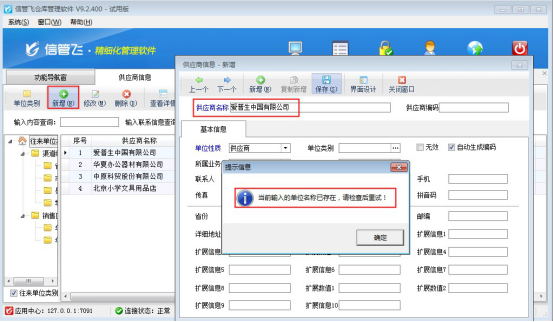 信管飛倉庫管理軟件、信管飛RMS軟件等支持開單直接新增往來單位(供應(yīng)商或客戶信息),開單如果往來單位提示自動保存,為例避免重復(fù)登記往來單位名稱,軟件支持設(shè)置新增往來單位不允許重復(fù)。以“信管飛倉庫管理軟件”為例,示范下如何設(shè)置往來單位不允許重復(fù)。 在功能導(dǎo)航窗選擇“系統(tǒng)管理”—》“系統(tǒng)參數(shù)配置”,在業(yè)務(wù)參數(shù)的“數(shù)據(jù)可重復(fù)參數(shù)”中取消勾選“往來單位名稱可重復(fù)”參數(shù),然后保存設(shè)置。如下圖所示: 參數(shù)設(shè)置完成后,打開功能導(dǎo)航窗“基礎(chǔ)資料”—》“供應(yīng)商信息”