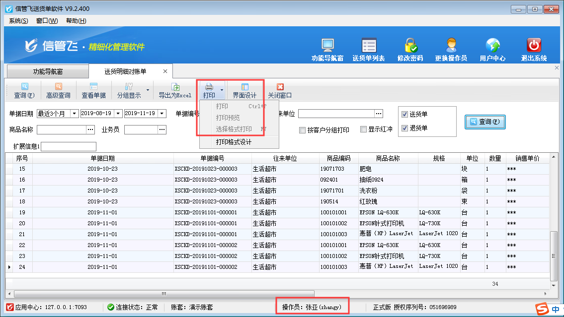 信管飛送貨單軟件為集訂單管理、送貨管理、收款結(jié)算等功能并支持送貨明細(xì)對賬及業(yè)務(wù)綜合對賬的送貨單打印軟件。軟件根據(jù)錄入的每張訂單及送貨單等數(shù)據(jù),可以自動生成統(tǒng)計報表,完成企業(yè)銷售統(tǒng)計查詢和與客戶對賬的目的,如下圖所示。如果不希望員工賬號登錄后打印送貨明細(xì)對賬單,如何設(shè)置呢?本篇文章介紹一下具體操作步驟。 登錄軟件,在功能導(dǎo)航窗點擊“系統(tǒng)管理”—》“操作員及授權(quán)”,進(jìn)入“操作員管理及授權(quán)”界面,選擇操作員“張亞”,在其右側(cè)的功能模塊權(quán)限內(nèi)選擇“統(tǒng)計查詢”模塊,將送貨明細(xì)對賬單的“打印”權(quán)限勾選取消,然后保存設(shè)置,如下圖所示: