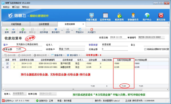 信管飛送貨單軟件、信管飛RMS軟件等支持錄入客戶的預(yù)付款,客戶預(yù)付款是指客戶付定金給我們,在實際發(fā)貨后會收回應(yīng)收款,此時軟件收款結(jié)算中支持客戶應(yīng)收款可以抵消之前客戶的預(yù)付款。本文以“信管飛送貨單軟件”為例,示范下應(yīng)收款如何抵消客戶預(yù)付款? 首先需要新增客戶的預(yù)付款,有以下兩種方式: ①客戶下訂單時付定金,可直接在開訂單時輸入預(yù)收定金。②直接在應(yīng)收款管理界面新增客戶預(yù)付款。 本文以方式①為例,首先新開訂單,在訂單界面,選擇客戶和商品明細(xì)后,在預(yù)收定金中