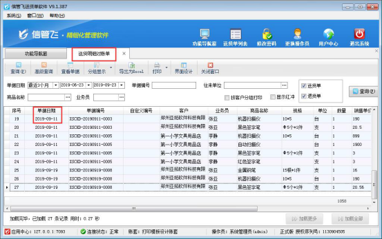 信管飛送貨單軟件支持開送貨單以及支持對已開單據明細匯總在送貨明細對賬單重,方便對賬。有時候需要把明細對賬單導出發給對應的客戶進行對賬。軟件送貨明細對賬單默認日期格式是顯示時間的,為了導出Excel文件更簡潔明了,軟件可設置送貨明細對賬單表的日期格式不顯示時間,只顯示出單據日期。 功能導航窗選擇“業務處理”,在最右側查詢統計下點擊“送貨明細對賬單”進入送貨明細對賬界面,點擊工具欄的“界面設計”按鈕,單據日期的“日期格式”選擇“YYYY-MM-DD”,保存界面設置。如下圖所示: