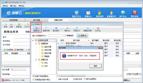 信管飛RMS軟件是集采購管理、銷售管理、庫存管理、往來賬管理等為一體的進銷存管理軟件。經常會有用戶問到刪除客戶資料時會彈出提示信息:“當前選擇的往來單位在單據中有使用,不能刪除”(如下圖一所示),刪除不了,為什么? 系統默認在單據中已使用過的往來單位信息是不能刪除的,因為如果刪除,則會影響之前已使用此往來單位信息所開的業務單據,對于此種情況,我們可以將需要刪除的往來單位設置為無效,本篇文章我們來介紹信管飛RMS軟件內如何將客戶信息設置為無效? 圖一 &