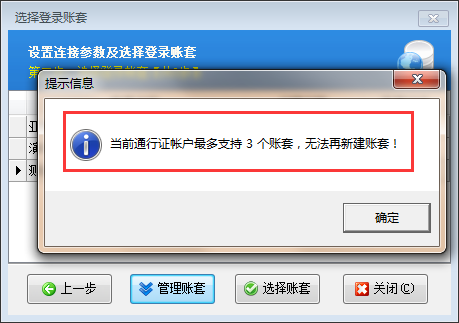 新建帳套時(shí)如果出現(xiàn)如下提示,說(shuō)明帳套數(shù)量已經(jīng)超過(guò)所購(gòu)買(mǎi)的云帳套數(shù)量。如果需要增加更多的帳套,可聯(lián)系我們客服。