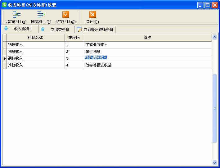 2、對方科目分為收入科目和支出科目(基礎資料->對方科目維護),便于進行統計分析。
