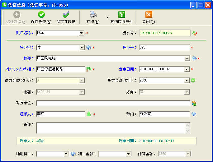 日記賬憑證信息,經過優化后,摘要欄可顯示更多內容,對方科目可以通過雙擊輸入框快速錄入