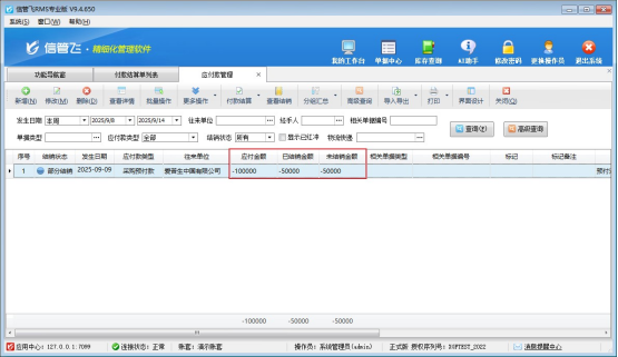 信管飛管理軟件專業版、標準版、星光版都支持錄入預付款,預付款是提前預付訂金,這種情況下貨物還沒有發出。如果還沒有形成相應的訂單,這時我們可以直接錄入往來單位的預付款。下面我們以信管飛軟件為例來演示一下具體的操作步驟。 已支付供應商采購預付款10萬元,供應商退回5萬元該如何在系統里面登記呢?首先在應付款管理界面找到登記的預付款記錄,如圖所示: 在付款結算單界面單獨結算這一筆采購預付款的賬單,付款金額錄入-50000元,可以在備注項錄入供應商退回以便后續