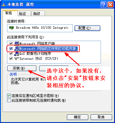 3)檢查“本地連接”中是否啟用了“Microsoft 網絡的文件和打印機共享”,如果沒有這一項,請安裝相應的協議。