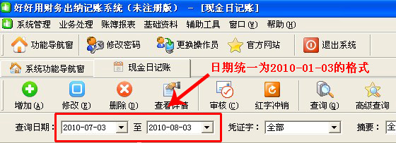 在業(yè)務(wù)處理—》現(xiàn)金日記賬窗口中查看系統(tǒng)最新保存的日期格式(即2010-07-03的格式)。