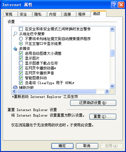 (1)設置在IE選型的高級標簽頁,復選 顯示圖片,然后重啟瀏覽器。具體操作如下圖所示: