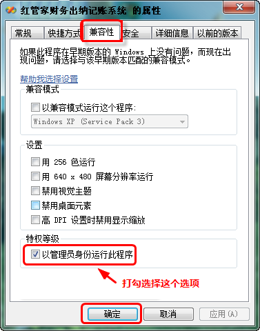 (2)系統(tǒng)會彈出屬性窗口,請在“兼容性”標(biāo)簽頁中選中“以管理員身份運行此程序”復(fù)選框,然后點擊“確定”按鈕。