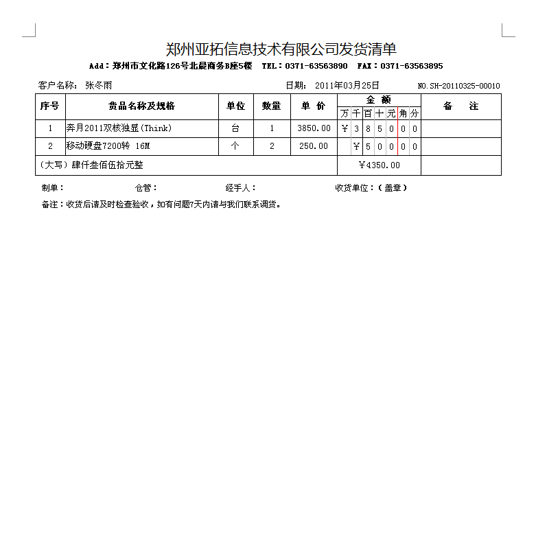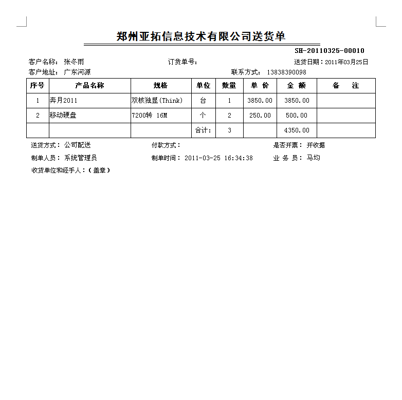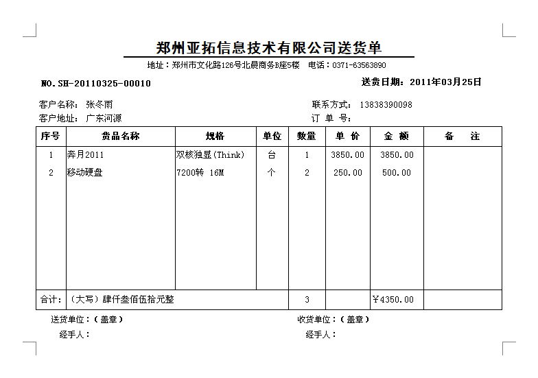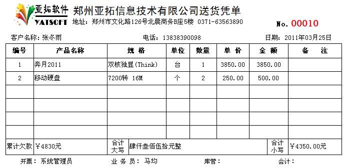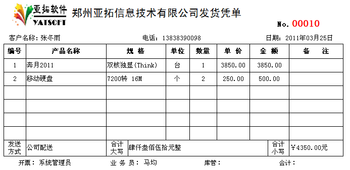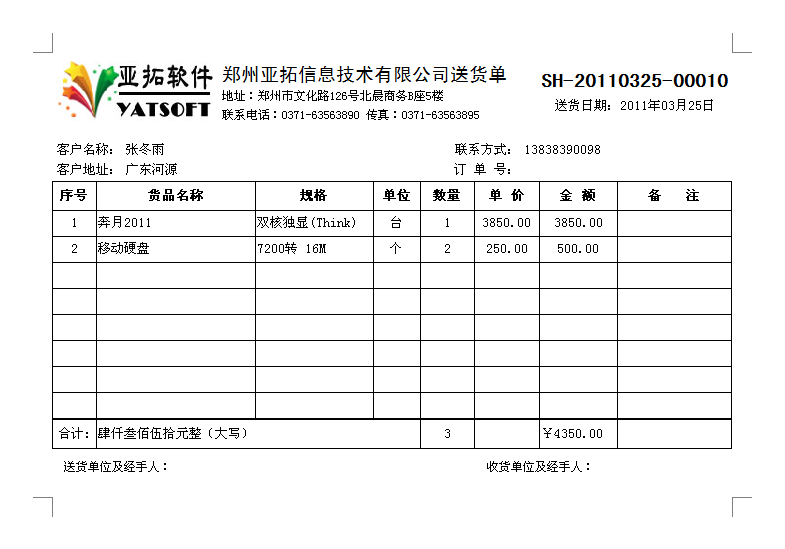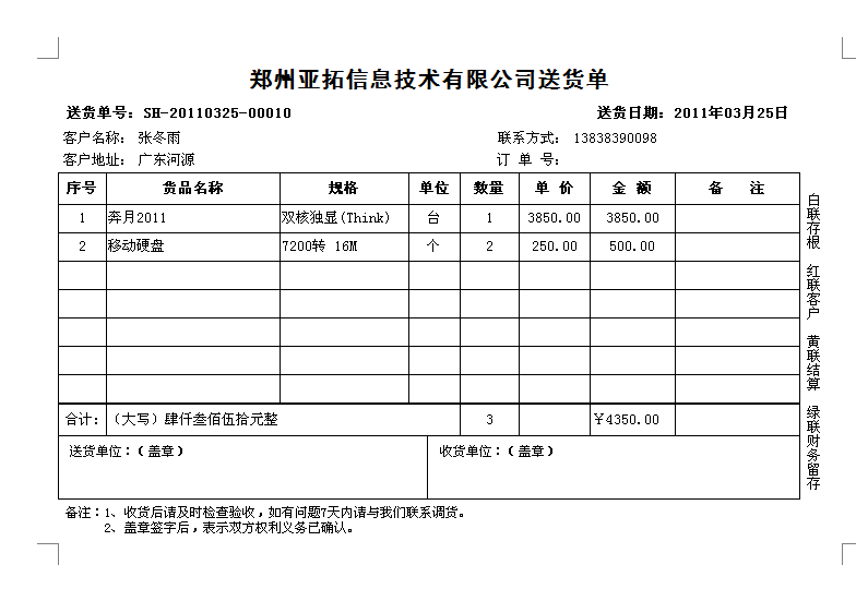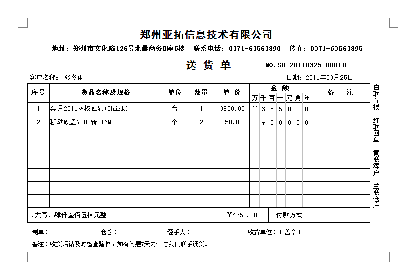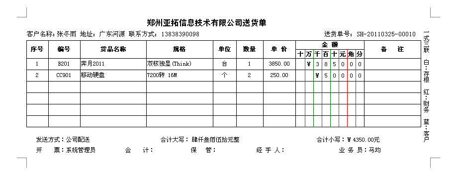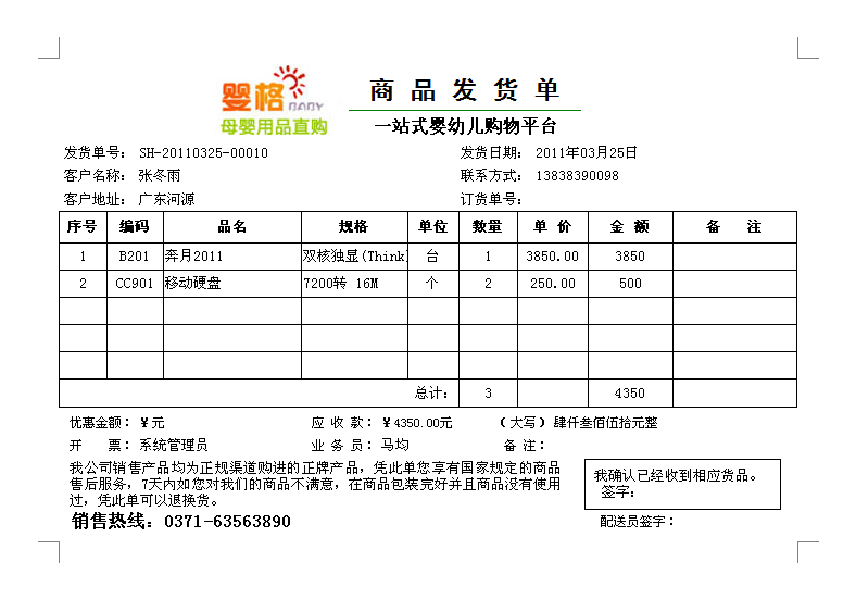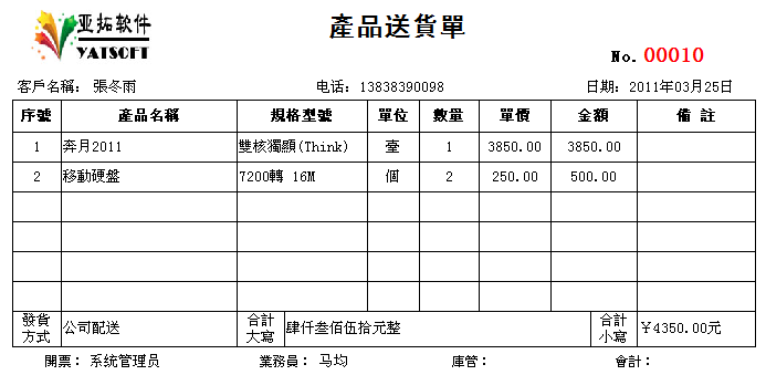 2011年12月31日前購買正版送貨單軟件,我們可免費定制送貨單樣式一套,以后如果新設(shè)計打印格式模板每個50元。系統(tǒng)內(nèi)置了一些送貨單打印格式供參考,可在現(xiàn)有模版的基礎(chǔ)上進行定制,也可以將送貨單格式進行掃描發(fā)送給我們,由我們進行定制。