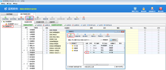 添加操作員:可以將“部門員工信息”中的員工設(shè)置為操作員,支持批量設(shè)置。如圖3所示,選中“普通操作員”權(quán)限組,點(diǎn)擊“添加操作員”按鈕,勾選相應(yīng)的操作員后點(diǎn)擊“選擇”按鈕。