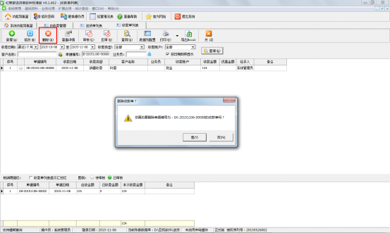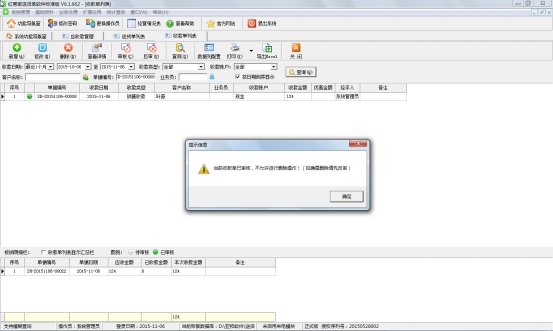 如果相應(yīng)的收款單已經(jīng)審核過(guò)了,此時(shí)刪除時(shí),系統(tǒng)會(huì)提示“當(dāng)前收款單已審核,不允許進(jìn)行刪除操作!(如確需刪除請(qǐng)先反審)”,如下圖五所示。