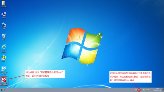 主機電腦開機且運行“亞拓管理軟件應用中心”程序;點擊桌面上的“亞拓管理軟件應用中心”程序圖標(或者在開始菜單中點擊程序組中的相應功能),即可打開運行應用中心程序。應用中心程序運行后會在桌面右下角顯示應用中心圖標: