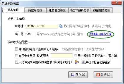 主機電腦的Windows防火墻或其他安全軟件的防火墻上需要開放相應的端口,軟件支持自動添加防火墻規則。在應用中心程序點“系統參數”可以設置自動添加端口到防火墻。