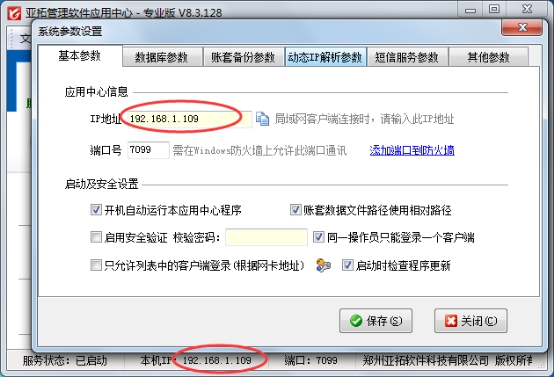 ①應用中心IP地址即主機電腦的IP地址,可以在主機上的應用中心程序上查看(在狀態欄和系統參數設置中都可以看到),如下圖所示: