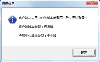 ③如果登錄的時候提示如下信息,則表明客戶端程序的版本類型與主機電腦上的應用中心程序的版本類型不一致,請使用相同版本類型的程序登錄即可。