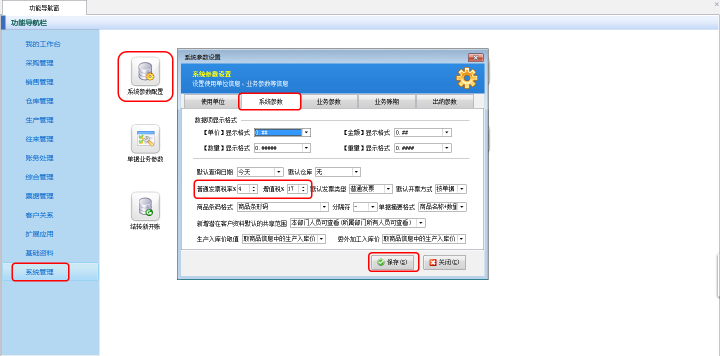 在功能導(dǎo)航窗點(diǎn)擊“系統(tǒng)管理”——“系統(tǒng)參數(shù)配置”——“系統(tǒng)參數(shù)”,在“系統(tǒng)參數(shù)”界面可以設(shè)置“普通發(fā)票稅率”及“增值稅發(fā)票稅率”(這里分別設(shè)置為4%及17%),設(shè)置完之后點(diǎn)擊“保存”按鈕保存配置,如下圖一所示。