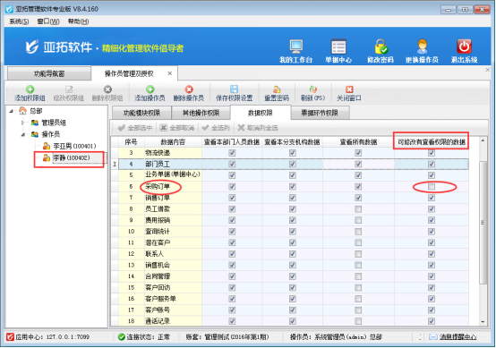 亞拓管理軟件、紅管家出納記賬軟件、紅管家倉庫管理軟件等都可以設置操作員的查看修改業務單據權限。通過設置操作員的“數據權限”,更清晰方便的管理分配的操作員單據權限。通過“系統管理”---》操作員及授權進入操作員管理及授權界面,在權限模塊可看到“數據權限”,在此設置操作員的“可修改有查看權限的數據”的權限,如圖1所示: