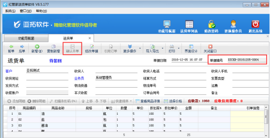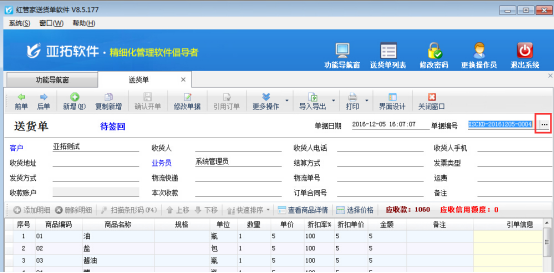 紅管家送貨單軟件亞拓管理軟件等在單據保存的時候會自動生成單據編號,可根據此單據編號來查詢單據信息。為了更加自定義編號內容,軟件支持修改自動生成的單據編號,以送貨單軟件為例,示范如何修改已生成的單據編號。