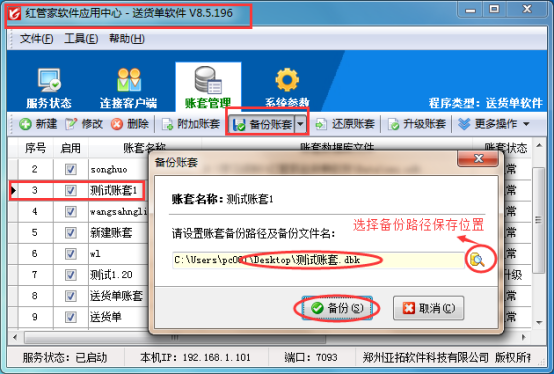 送貨單單機(jī)版更換電腦需要首先把原來的電腦做好備份工作,備份是在電腦的應(yīng)用中心(紅色圖標(biāo))上進(jìn)行操作。備份時可以選擇備份的保存路徑,為了更清晰的看到備份數(shù)據(jù)方便拷貝,可以把備份路徑更改為桌面。具體操作如下圖1所示: