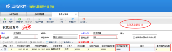 客戶結(jié)銷存在優(yōu)惠金額,例如下圖應(yīng)收款金額為13380元,優(yōu)惠了380元,實付款13000元。在收款結(jié)算時,本次結(jié)銷金額依舊填寫“13380”收款金額填寫“13000”優(yōu)惠金額輸入“380”,然后點擊“保存”應(yīng)收款結(jié)算完成。如下圖4所示: