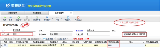客戶本次結(jié)銷金額大于其應(yīng)收金額,可以在結(jié)銷應(yīng)收款的時候,把多余的應(yīng)收款轉(zhuǎn)存為客戶預(yù)付款,可以在下次結(jié)銷應(yīng)收款時進(jìn)行抵消應(yīng)收款。例如下圖,客戶本次收款金額為2900元,實付款3000元。在“收款結(jié)算單”界面,本次結(jié)銷金額正常填寫當(dāng)前可結(jié)銷金額2900元,收款金額填寫“3000元”,勾選上“結(jié)銷后余額轉(zhuǎn)存為預(yù)付款”,則結(jié)銷完成,在應(yīng)收款管理界面會增加一個“客戶預(yù)付款”單據(jù),如下圖5、圖6所示: