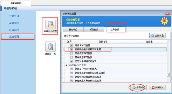 選擇“功能導航窗”的系統管理,選擇“系統參數配置”打開,選擇“業務參數”中的“相同商品名稱規格不可重復”的參數進行打鉤,保存。如下圖所示: