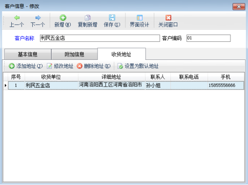 在功能導(dǎo)航窗點(diǎn)“基礎(chǔ)資料”—》“客戶信息”即可進(jìn)入“客戶信息”界面,如圖1所示,點(diǎn)擊“修改”按鈕,打開客戶信息修改窗口,基本信息中的“詳細(xì)地址”就是開單默認(rèn)地址,點(diǎn)擊“收貨地址”,可以維護(hù)其他的收貨地址信息。