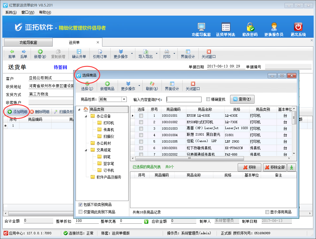 亞拓管理軟件紅管家倉庫管理軟件紅管家送貨單軟件等為了方便用戶可以快速開單,在單據中點擊“添加明細”按鈕默認都是彈出商品選擇窗口(如下圖一所示),可以快速選擇所需商品信息,但是部分用戶在開單時需要直接錄入新商品,而不是在商品信息庫中進行選擇,對于此種情況,軟件支持設置在單據中點擊“添加明細”按鈕時不彈出商品選擇窗口,本篇文章我們以紅管家送貨單軟件為例來詳細介紹一下如何設置在單據中點擊“添加明細”按鈕時不彈出商品選擇窗口?