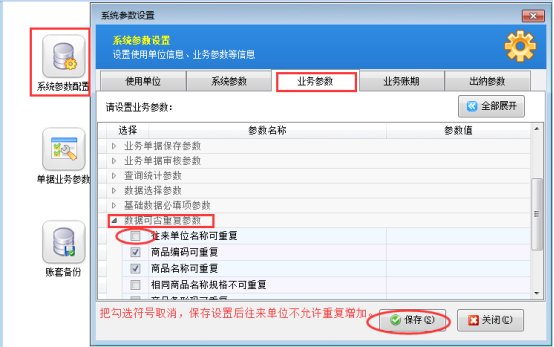 以亞拓管理軟件專業(yè)版為例,在系統(tǒng)管理—》系統(tǒng)參數(shù)配置—》業(yè)務(wù)參數(shù)中的“數(shù)據(jù)可重復(fù)參數(shù)”把“往來單位名稱可重復(fù)”的勾選符號取消,然后保存設(shè)置。如下圖所示: